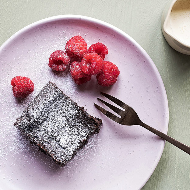 4. Sift cocoa and baking powder into the egg mixture and add the  ground almonds. Carefully fold in with the melted chocolate and butter. Pour into the prepared tin. Bake for 45-50 minutes. The brownie will still feel quite soft when touched in the middle. Allow to cool in the tin before cutting into squares. Dust with icing sugar before serving.