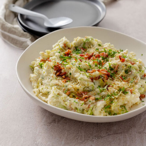 - Fold the creamy cabbage mixture as well as ¾ of the leek & breadcrumb mix and the bacon crumb into the mashed potatoes until well combined.