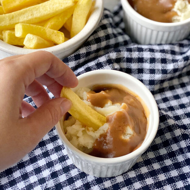 - Pour the gravy over the mashed potato and serve with fries or crispy chicken for dipping.