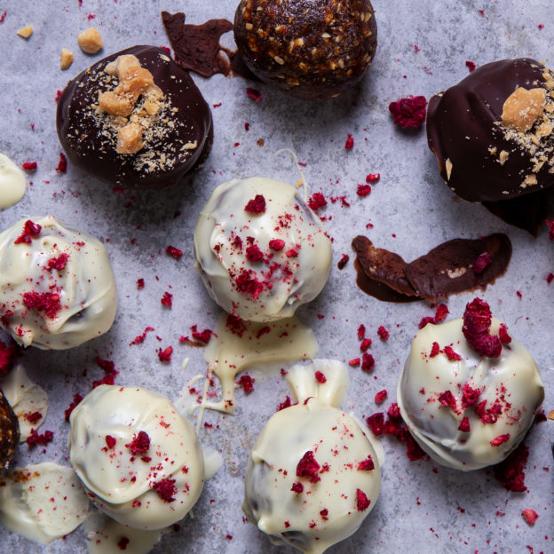 - Heat chocolate in a bowl over hot water until melted. Alternatively melt chocolate in a microwave using 30 second high power bursts. Using a wire chocolate dipper or 2 forks, dip the truffles into the white or dark chocolate. Lift them out and allow the excess chocolate to run off and dust with desired topping. Place on a baking paper lined tray. Refrigerate until chocolate is set.