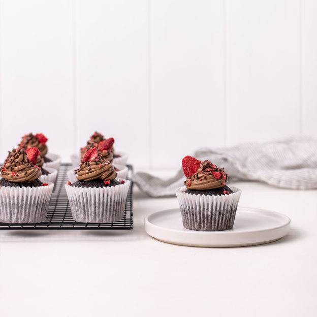 - Once the cupcakes are cold. Pipe or spread with the buttercream. Decorate with freeze dried raspberries or chocolate chips. These are best made and served the same day.