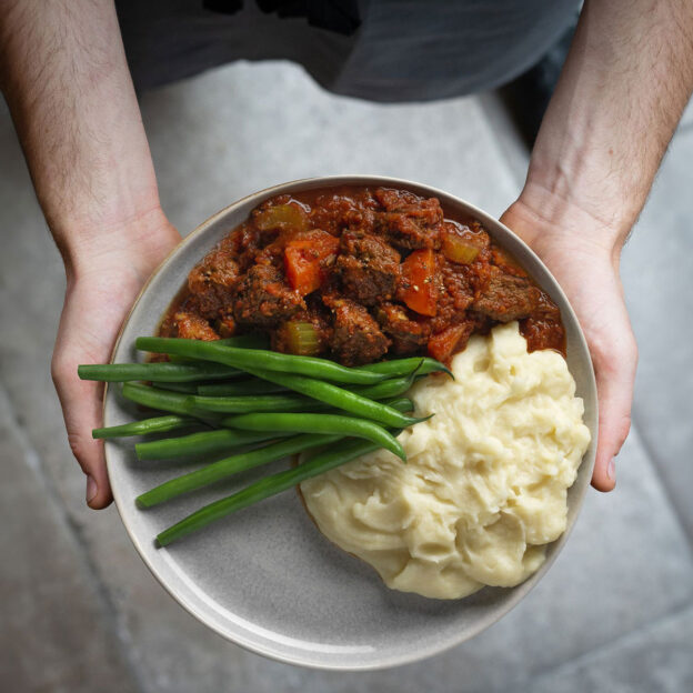 To slow cook, reduce beef stock to ½ cup. Cook in slow cooker on high for 4 to 5 hours until tender. Stir in Cinderella Instant Mashed Potatoes to thicken.